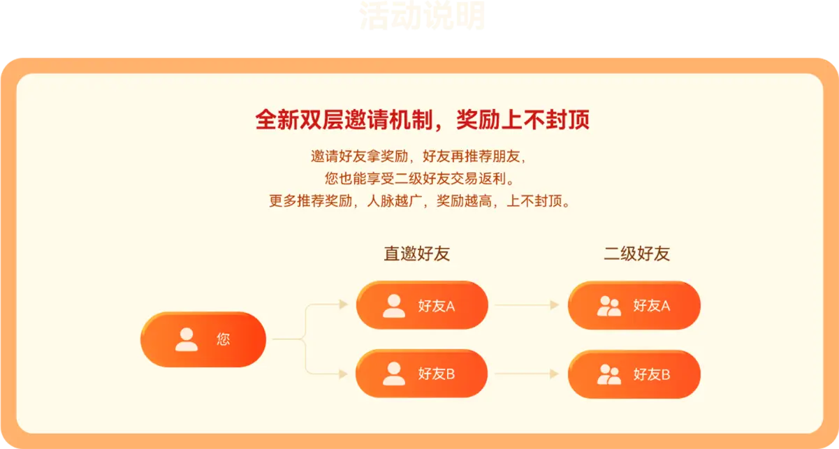 (3)存款奖励统计的是直接单个邀请好友在激活后30天内的累计存款,当存款达到对应层级,即可领取对应的存款奖励。按每周发放时最新存款金额数据发放。
