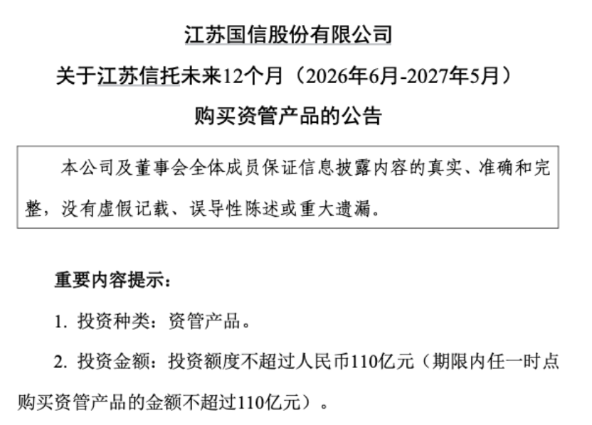 据披露,江苏信托拟于2026年6月至2027年5月期间使用自有资金购买资管产品,投资额度不超过人民币110亿元(期限内任一时点购买资管产品的金额不超过110亿元),并授权公司经理层具体实施相关事宜。在上述额度内,资金可滚动使用。